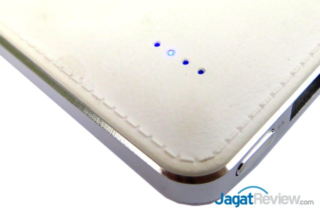 Bagian sisi power bank terdapat tombol ON/OFF, dua output USB berukuran 1A dan 2.1A, serta satu buah input microUSB untuk mengisi ulang baterai.