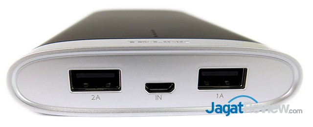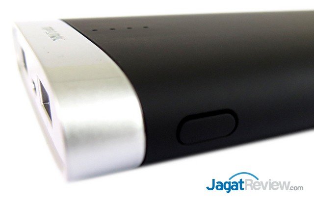 Pada bagian permukaan power bank, terdapat 4 buah lampu indikator yang menentukan sisa kapasitas power bank. Sementara pada bagian bawah power bank merupakan tempat port output dan input yang berupa port USB 5V 1A/2A dan port microUSB 5V 2V.
