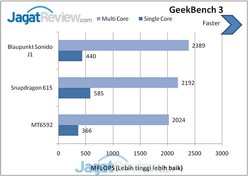 GeekBench 3 merupakan benchmark cross platform yang mengukur kinerja prosesor sebuah perangkat smartphone, tablet, dan PC. Aplikasi ini menggunakan skenario simulasi real world sehingga mampu menganalisa performa sebuah prosesor saat menggunakan single core atau multi core. Semakin tinggi nilainya, semakin baik.