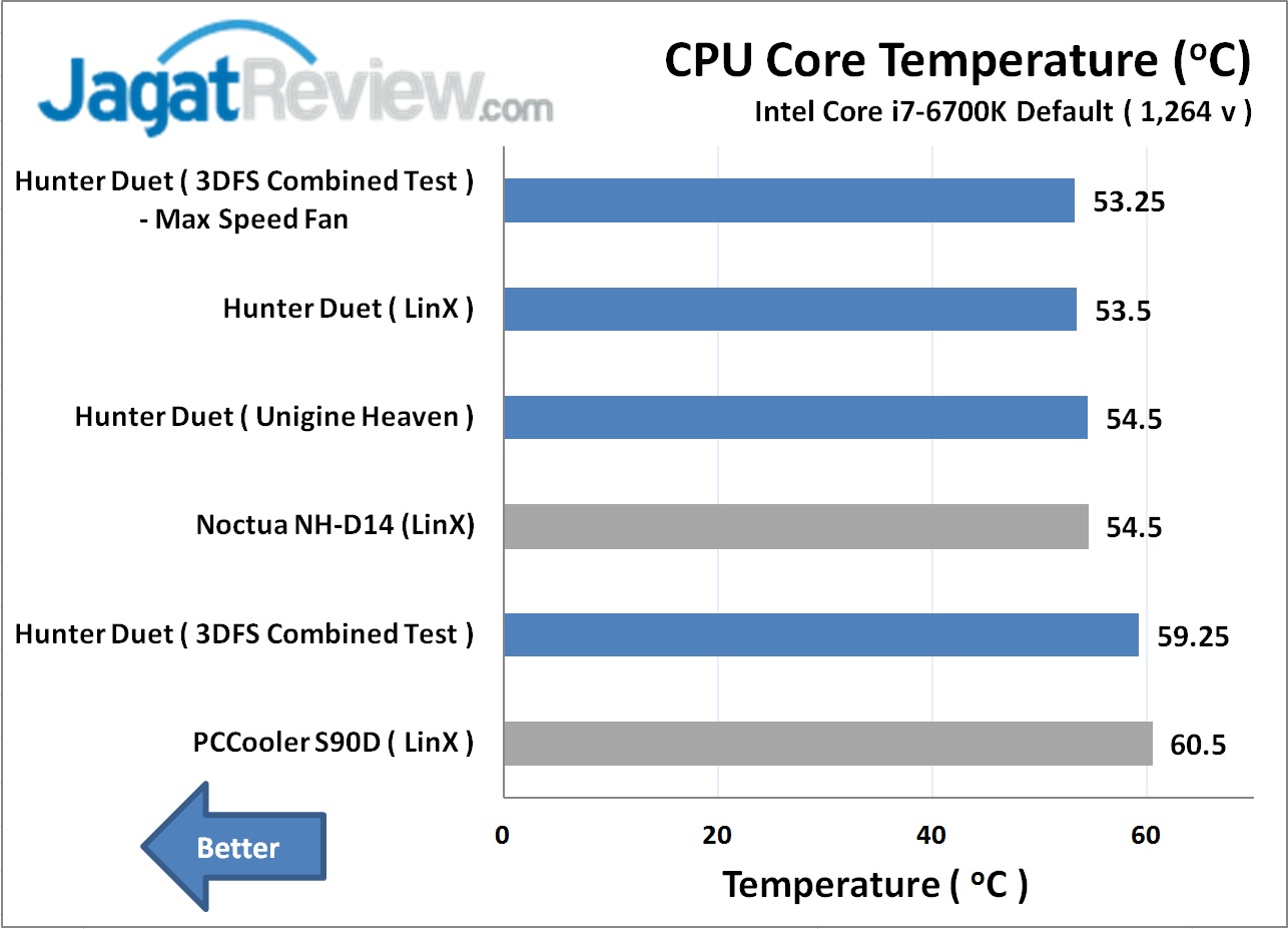 Dari hasil pengujian dengan menggunakan aplikasi LinX, kami menemukan bahwa performa watercooling Hunter Duet mampu mendinginkan prosesor Intel Core i7-6700K hanya unggul tipis 1 oC dibandingkan dengan sebuah heatsink pendingin kelas high-end, Noctua NH-D14. Pada pengujian ini kami menggunakan konfigurasi kecepatan FAN yang diatur pada mode “AUTO”. Selama menjalankan aplikasi LinX, kami hampir tidak dapat mendengar suara fan radiator berputar, karena kedua fan radiator milik ID-COOLING ini tetap berputar pada kecepatan minimum 800RPM.