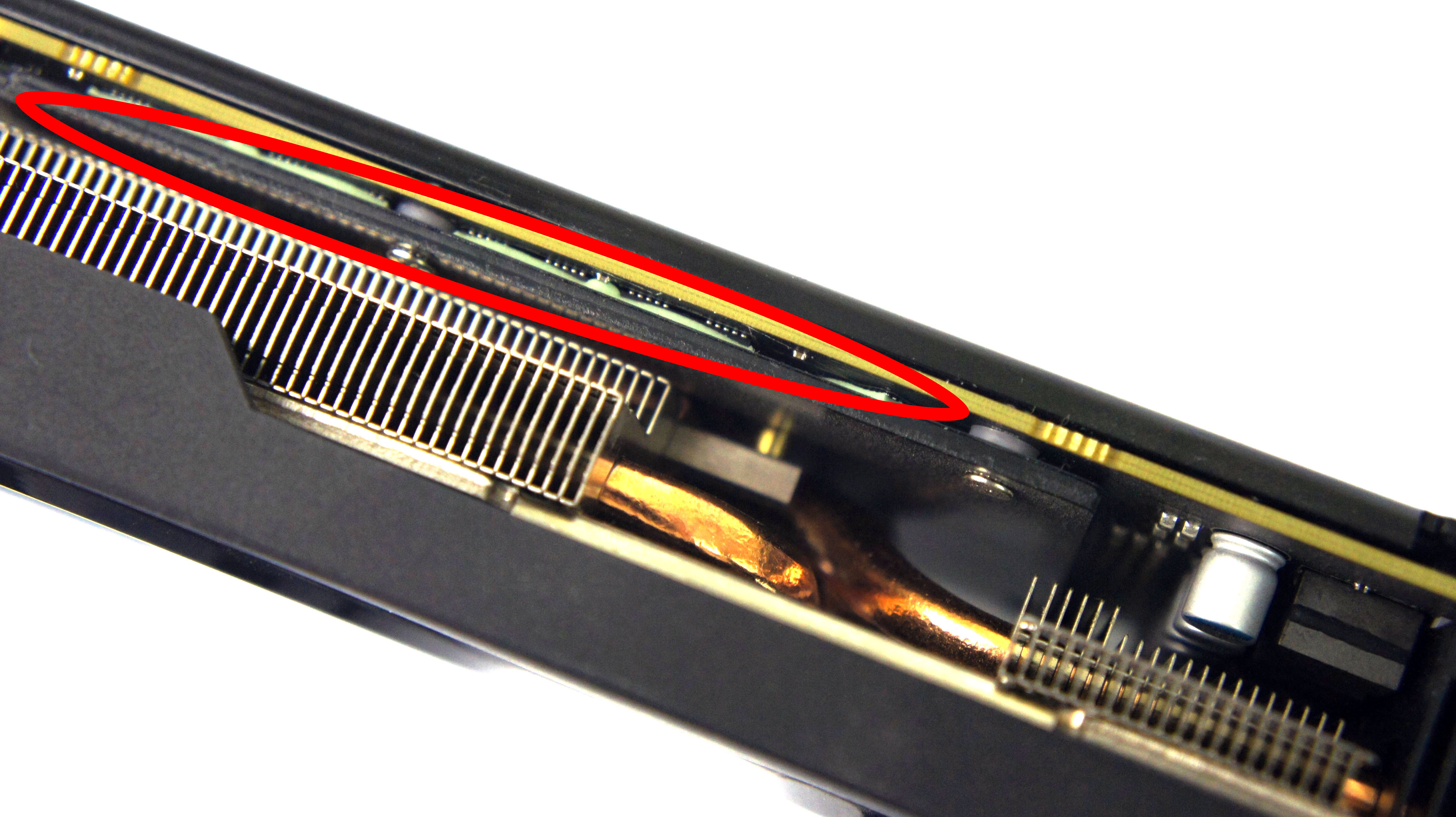 XFX sendiri menggunakan teknologi yang dinamakan XFX Extreme VRM and Memory cooling. Terlihat pada gambar yang ditandai marker warna merah, terdapat lapisan hitam dan dan cooling pad( berwarna hijau ) yang diklaim mampu menurunkan suhu VRM hingga 30C, dan suhu memory hingga 20C.