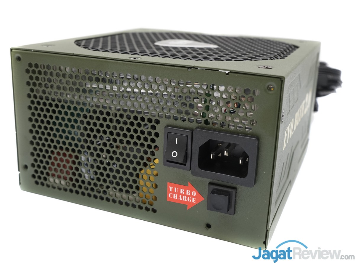 Seperti yang sudah kami bahas sebelumnya, PSU ini dilengkapi dengan fitur Turbo Charge. Fitur ini sendiri bisa diaktifkan dengan tombol yang ada di dekat konektor AC In PSU. Fitur Turbo Charge ini akan menambah kapasitas daya maksimum PSU ini sebesar 100 Watt (650 Watt + 100 Watt = 750 Watt) ketika diaktifkan.