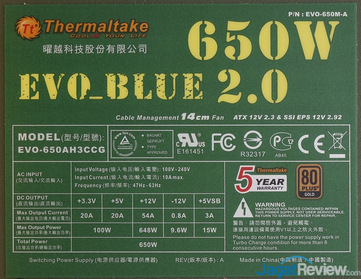 Berikut spesifikasi singkat dari PSU Thermaltake Evo Blue 2.0 650W: