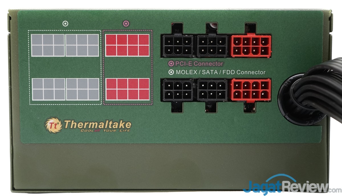 Thermaltake hanya melengkapi PSU berkapasitas daya 650 Watt ini dengan 1 unit kabel modular power molex yang memiliki 4 konektor power 4-pin molex.