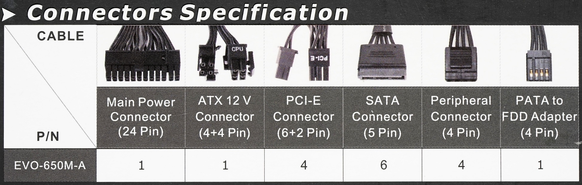 Selain kabel 24-pin dan 4+4 pin di atas, kabel-kabel lain yang dimiliki EVO Blue 2.0 merupakan kabel modular. Terdapat beberapa konektor di PSU ini yang mengakomodasi beberapa kabel power lain yang dibutuhkan PC, antara lain power PCIe, SATA dan molex. Berikut kabel-kabel modular dan konektor yang tersedia pada Thermaltake Evo Blue 2.0 :