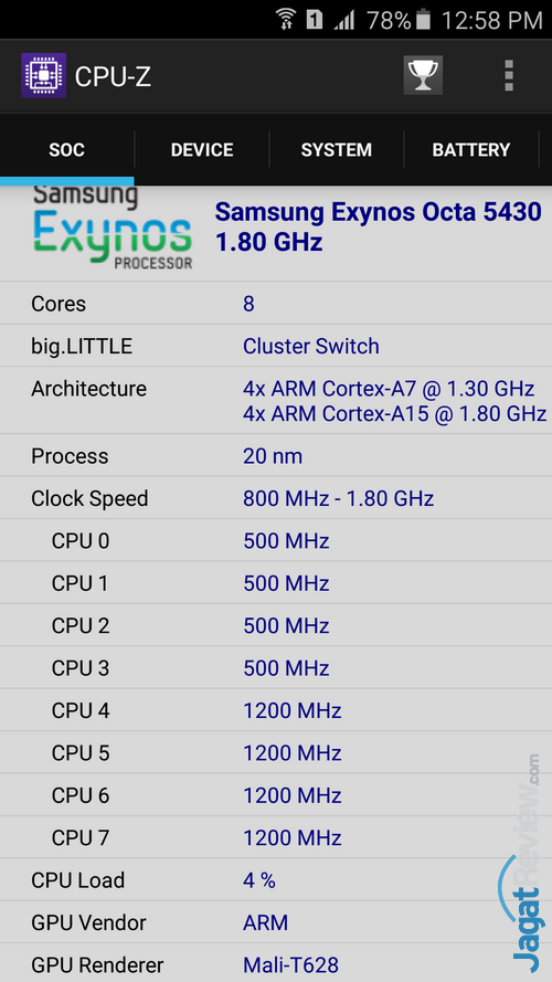 Seperti yang terlihat di atas, Galaxy A8 ini dilengkapi dengan SoC Exynos Octa 5430 besutan Samsung sendiri. SoC ini memiliki prosesor octa core dengan empat core Cortex A7 dan empat core Cortex A15. RAM 2 GB juga disematkan Samsung di smartphone berlayar 5.7 inci ini. Resolusi maksimal yang didukung smartphone ini adalah 1920 x 1080. Smartphone ini telah mendukung WiFi AC dan jaringan 4G LTE.