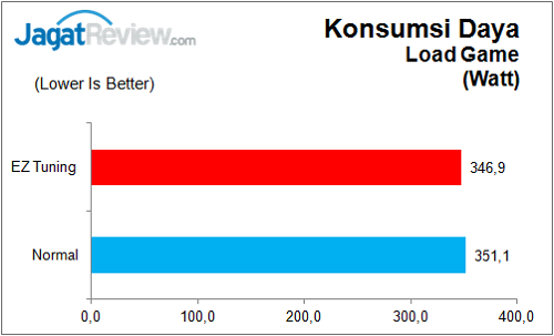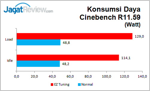 Pengukuran untuk kondisi full load dilakukan dengan membebani sistem dengan aplikasi Cinebench R11.59 dan game Lost Planet 2. Sedangkan pengukuran untuk kondisi idle dilakukan dengan membuat sistem tidak melakukan aktifitas selama sekitar 10 menit.
