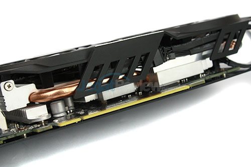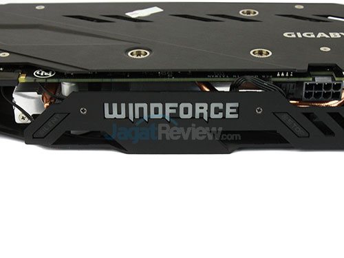 Dibawah kipasnya terdapat heatsink besar yang dilengkapi dengan heat-pipe tembaga yang ditujukan untuk memberikan pembuangan panas yang lebih baik disaat full-load. Heatsink ini tak hanya menutupi GPU-nya saja, memorinya juga turut didinginkan. Bahkan Gigabyte juga memberikan heatsink tambahan pada komponen yang tak tersentuh heatsink utama, seperti pada komponen MOSFET-nya.