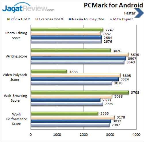 Kami telah melakukan pengujian daya tahan baterai dengan menggunakan aplikasi BatteryXPRT secara berulang-ulang. Smartphone ini memiliki baterai dengan kapasitas 2200 mAh yang memang dianggap standar untuk layar 5 inci saat ini. Pengujian kami lakukan berdasarkan setting default yang berarti tidak menggunakan power saving yang mampu memperpanjang masa pakainya lagi. Hasilnya, Infinix Hot 2 ternyata mampu bertahan hingga 11 jam 15 menit! Tentunya hal tersebut sudah cukup untuk digunakan sehari-hari, walaupun beberapa pengguna tentu harus membawa power bank untuk bertahan seharian.