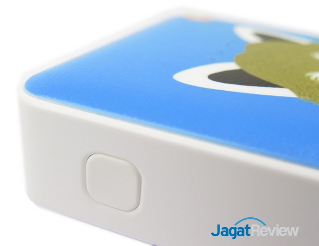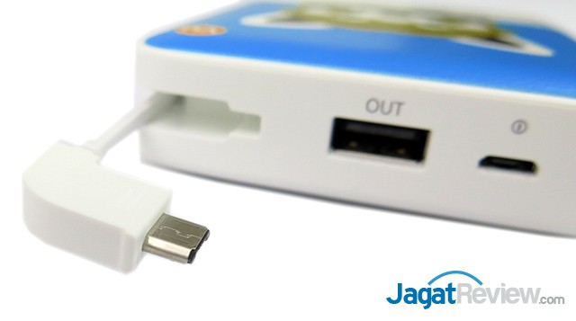 Di bagian atasnya, terdapat port output USB berdaya 5V/2A, port input microUSB berdaya sama yaitu 5V/2A, serta kabel microUSB yang sudah terhubung langsung dengan power bank dan bisa langsung digunakan jika tidak memiliki kabel USB terpisah. Sementara untuk tombol ON/OFF, berada di sisi kiri power bank yang bisa ditekan ketika hendak mengisi ulang perangkat menggunakan Samsung Animal Edition Battery Packs tersebut.