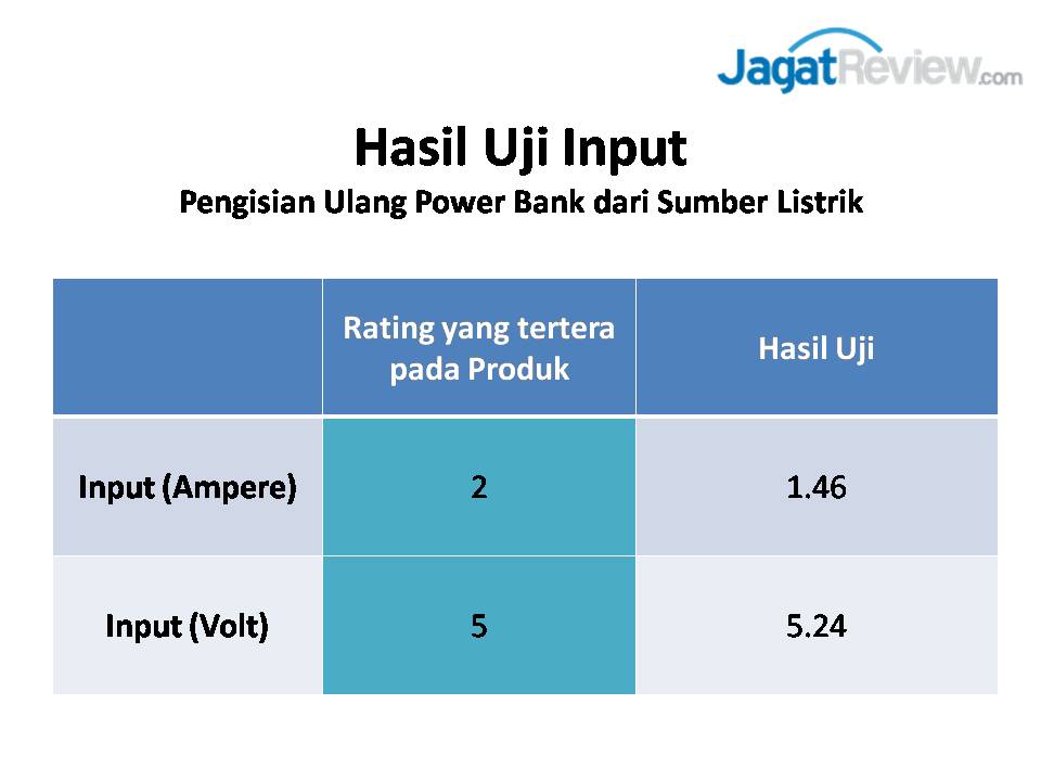 Pengujian kami kali ini adalah dengan menggunakan perangkat untuk mengukur besar arus yang dialirkan ketika melakukan proses charging, baik charging ke perangkat maupun power bank. Perlu diketahui bahwa input dan output yang terdapat pada power bank merupakan arus maksimal yang bisa dihasilkan, sehingga tidak berarti power bank yang ada mampu mengalirkan arus sebesar rating yang telah dicantumkan.