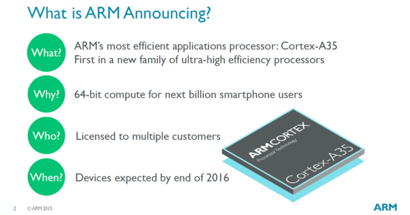 Sebuah core baru telah diperkenalkan oleh ARM beberapa waktu yang lalu. Core baru ini merupakan core 64-bit hemat daya dengan basis instruksi ARMv8-A, dan disebut sebagai Cortex A35. ARM sendiri menyebutkan bahwa core ini tidak ditujukan untuk menggantikan posisi Cortex A53, tetapi untuk menjangkau berbagai perangkat lain yang membutuhkan core hemat daya, termasuk wearable.