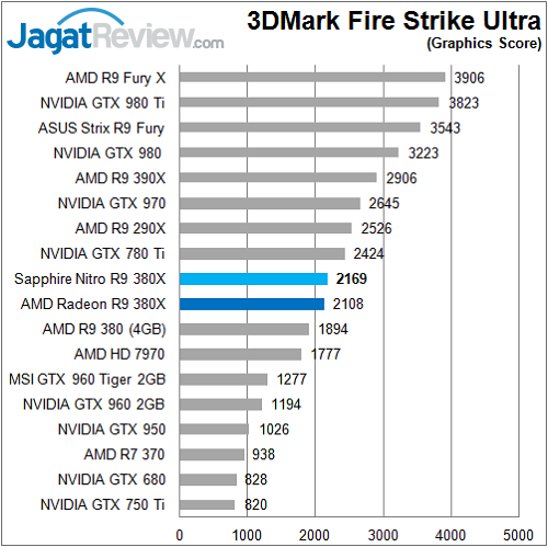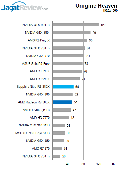 *) Pada pengujian kali ini kami coba membandingkan performa Spesifikasi reference Radeon R9 380X dengan spesifikasi Sapphire Nitro R9 380X. Spesifikasi reference kami dapatkan dengan cara menurunkan clock speed dan memori speed graphic card Sapphire tersebut ke angka 970 MHz dan 5700 MHz untuk memorinya.