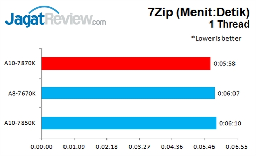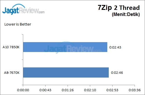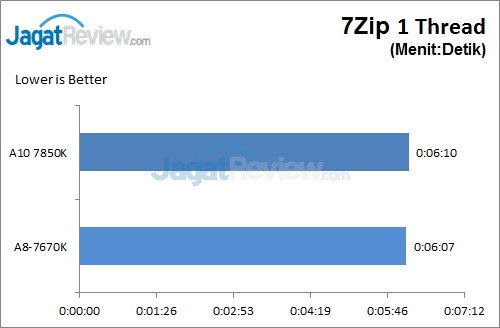 7Zip merupakan aplikasi kompresi file ke format *.7z. Aplikasi ini sangat menyukai prosesor dengan jumlah thread berlimpah dan dapat menyesuaikan kemampuan kompresi dengan jumlah thread pada prosesor. Hasil pengujian disajikan dalam satuan waktu. Semakin sedikit waktu yang dibutuhkan, semakin baik.
