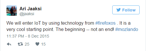 Dalam ajang developer Mozilla, “Mozlando”, beserta beberapa orang melakukan tweet di media sosial masing-masing mengenai Mozlando tersebut, mengatakan bahwa Mozilla resmi menghentikan layanan Firefox OS tersebut untuk smartphone. Namun demikian, ini bukan berarti Firefox OS akan sungguh-sungguh “mati”. Ari Jaaksi, Senior Vice President of Connected Devices dari Mozilla menyatakan bahwa ini akan menjadi sebuah awal, bukan akhir. Pada tweet-nya, Jaaksi juga mengatakan bahwa Firefox OS akan kembali lagi sebagai platform dari Internet of Things.