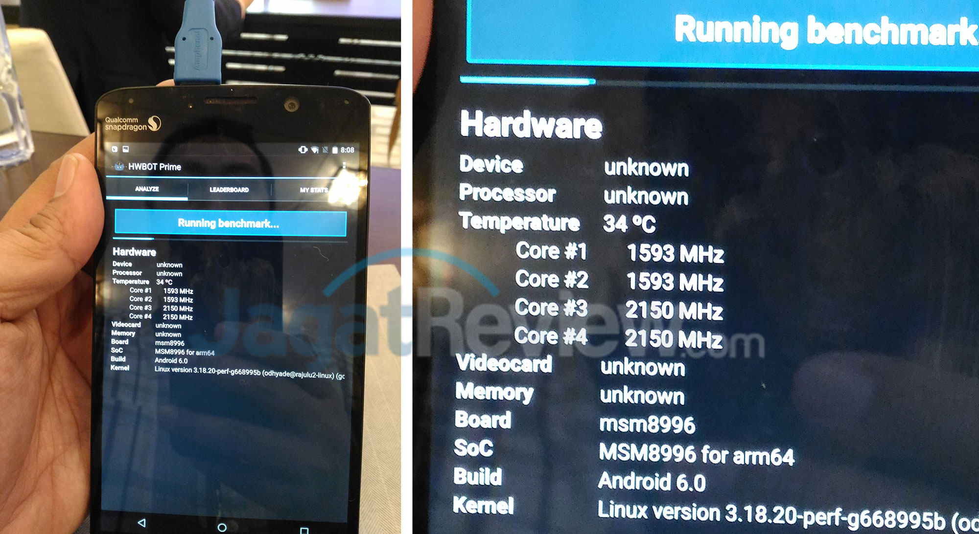 Untuk mengetahui lebih lanjut mengenai suhu internalnya, kami mencoba peruntungan dengan menginstalasikan aplikasi HWBOT Prime, sembari berharap bahwa aplikasi ini bisa mendeteksi suhu prosesor sembari membebaninya. Software benchmark ini mampu membebani sisi prosesor dari sebuah SoC (bukan GPU). Ternyata, harapan kami terkabul. HWBOT Prime tampak bisa mendeteksi suhu Snapdragon 820. Padahal, pada Snapdragon 615 dan 810 suhu ini tidak tampil. Tampaknya Qualcomm menggunakan register yang sama dari Snapdragon 800 dan digunakan pada seri 820 ini. Sebab, HWBOT Prime bisa membaca temperatur pada Snapdragon 800 terdahulu.