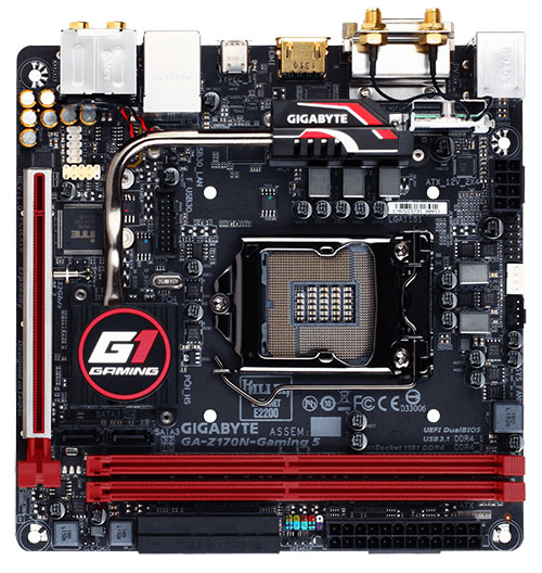 Menuruskan jejak Gigabyte Z97N-Gaming 5, tampilan motherboard Gigabyte Z170N-Gaming 5 tak jauh berbeda dengan pendahulunya itu. Nuansa tema merah hitam tetap melekat dan tetap ada heatsink yang saling terhubung dengan heatpipe untuk menjamin pembuangan hawa panas yang lebih baik, dan di atas heatsink tersebut terdapat identitas motherboard ini. Ya, di atas dua heatsink mungil tersebut terdapat logo Gigabyte dan G1 Gaming yang menandakan motherboard ini masuk dalam seri Gaming dari Gigabyte. Di sekitar soket prosesor LGA-1151 ini juga terdapat 5-Phase VRM yang bertugas membantu mengatur pasokan listrik ke prosesor.