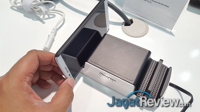 Dengan kemampuan charging yang besar ini, Anda bisa mengisi ulang hingga 4 iPad atau 4 tablet besar, dan 2 buah perangkat gadget ringan seperti smartphone atau peralatan lainnya. Huntkey pun mengutarakan rencana mereka untuk mengintegrasikan kemampuan wireless charging pada pelataran di sisi tengah charging station ini. Standar apa yang akan digunakan, belum ditentukan karena charging station ini pun masih dalam tahap penyelesaian.