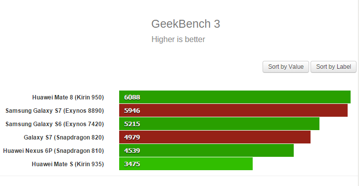 Snapdragon 820 memiliki nilai rendah di multi-core, karena hanya menggunakan empat inti prosesor (Quad-Core). Sementara SoC Exynos telah menggunakan delapan inti prosesor (Octa-Core). Namun untuk single-core, Snapdragon 820 memiliki nilai yang lebih tinggi yaitu sebesar 2,282 sedangkan Exynos 8890 dengan skor 1873. Skor tertinggi di benchmark Geekbench 3 masih dipimpin oleh Huawei Mate 8, yang menggunakan SoC Kirin 950 dengan nilai total 6088.