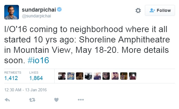 Pemberitahuan ini datang dari tweet milik Sundar Pichai, CEO dari Google, bahwa ajang Google I/O tahun 2016 akan diadakan pada 18-20 Mei 2016 berloka di di Mountain View. Lokasi ini sekaligus merupakan lokasi pusat rumah dari Google sendiri. Sementara untuk detil berikutnya mengenai acara tersebut, belum dijelaskan lebih lanjut.
