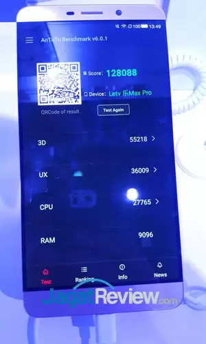 Kali ini, Qualcomm turut memamerkan Snapdragon 820 dalam wujud sebuah smartphone LeTv Max Pro. Kami pun diberi kesempatan untuk melihat dan mengulasnya lebih jauh untuk mengetahui seberapa tinggi performa yang dihasilkan LeTv Max Pro berbasis Snapdragon 820 ini. Seperti yang Anda lihat pada gambar di atas, hasil benchmark dari ponsel ini cukup impresif dengan skor AnTuTu mencapai 128088, Hasil skor yang diperoleh ini, tak terpaut jauh sewaktu ketika kami mencobanya di Beijing.