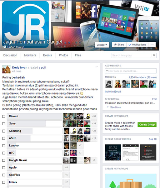 Anda akan diminta untuk ikut berpartisipasi dalam polling ‘Brand/Merek Smartphone’ Favorit melalui Group ‘Jagat Pembahasan Gadget.’ Anda bisa memilih dua brand smartphone yang paling anda suka. Polling ini dibuka mulai hari ini (18/01/2016) hingga Sabtu 23 Januari 2016.