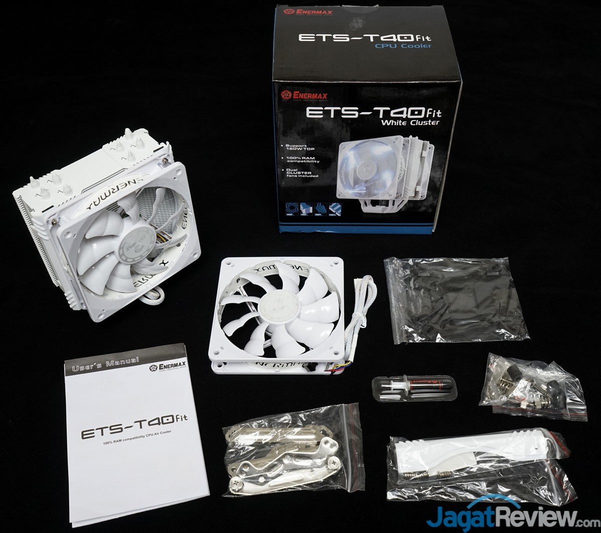 Pada paket penjualannya, Enermax ETS-T40fit White Cluster ini telah dilengkapi dengan fan bawaan kedua yang masih belum terpasang pada heatsink. Fan bawaan ini dilengkapi dengan lampu LED putih dan memiliki spesifikasi kecepatan putar yang mencapai 2200 RPM atau lebih cepat 400 RPM dibandingkan dengan versi fan bawaan Black Twister.