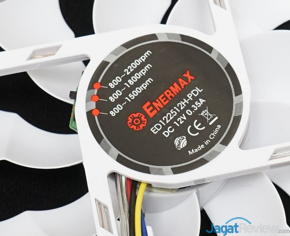 Pada bagian tengah fan bawaan Enermax ETS-T40fit White Cluster ini terdapat switch untuk mengatur kecepatan maksimum fan ini. Pada pengujian ini, kami mengatur switch ini pada pilihan 800~2200 RPM untuk menguji kemampuan maksimal HSF Enermax ETS-T40fit White Cluster dalam mendinginkan prosesor.