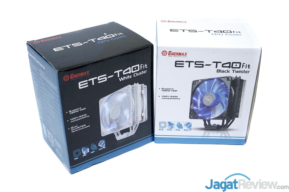 HSF Enermax ETS-T40fit hadir dengan bentuk fisik yang lebih slim dengan memadukan dua warna pada coating-nya yaitu hitam dan putih. Pihak Enermax mengklaim bahwa HSF barunya ini tidak akan mengalami permasalahan kompatibilitas terhadap memori RAM yang menggunakan heat-spreader berukuran besar. Selain itu, Enermax ETS-T40fit dilengkapi dengan 4 buat heatpipe ber-diameter 6mm, sama seperti HSF seri pendahulunya. Sedangkan untuk fan pendingin, produk HSF ini telah dilengkapi dengan fan LED yang akan menyala menerangi bagian dalam casing penggunanya pada saat komputer dinyalakan. Berikut review dari kami mengenai performa Enermax ETS-T40fit untuk versi Black Twister.