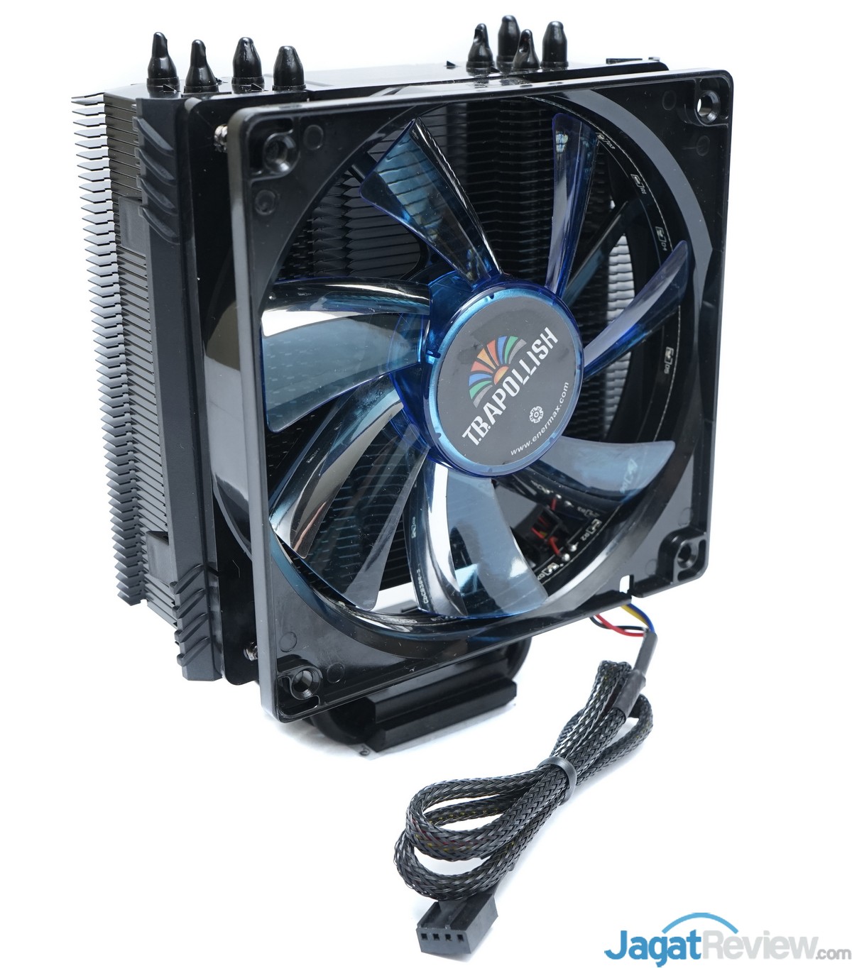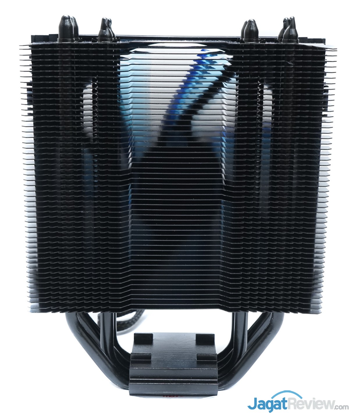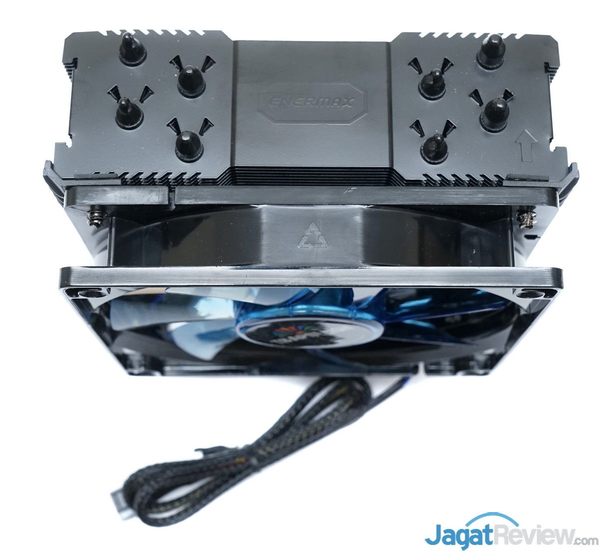 Pada bagian depannya, HSF Enermax ETS-T40fit Black Twister telah dilengkapi dengan fan Enermax T.B Apollish yang memiliki kecepatan putar mencapai 1800RPM dan dilengkapi dengan lampu LED berwarna biru.