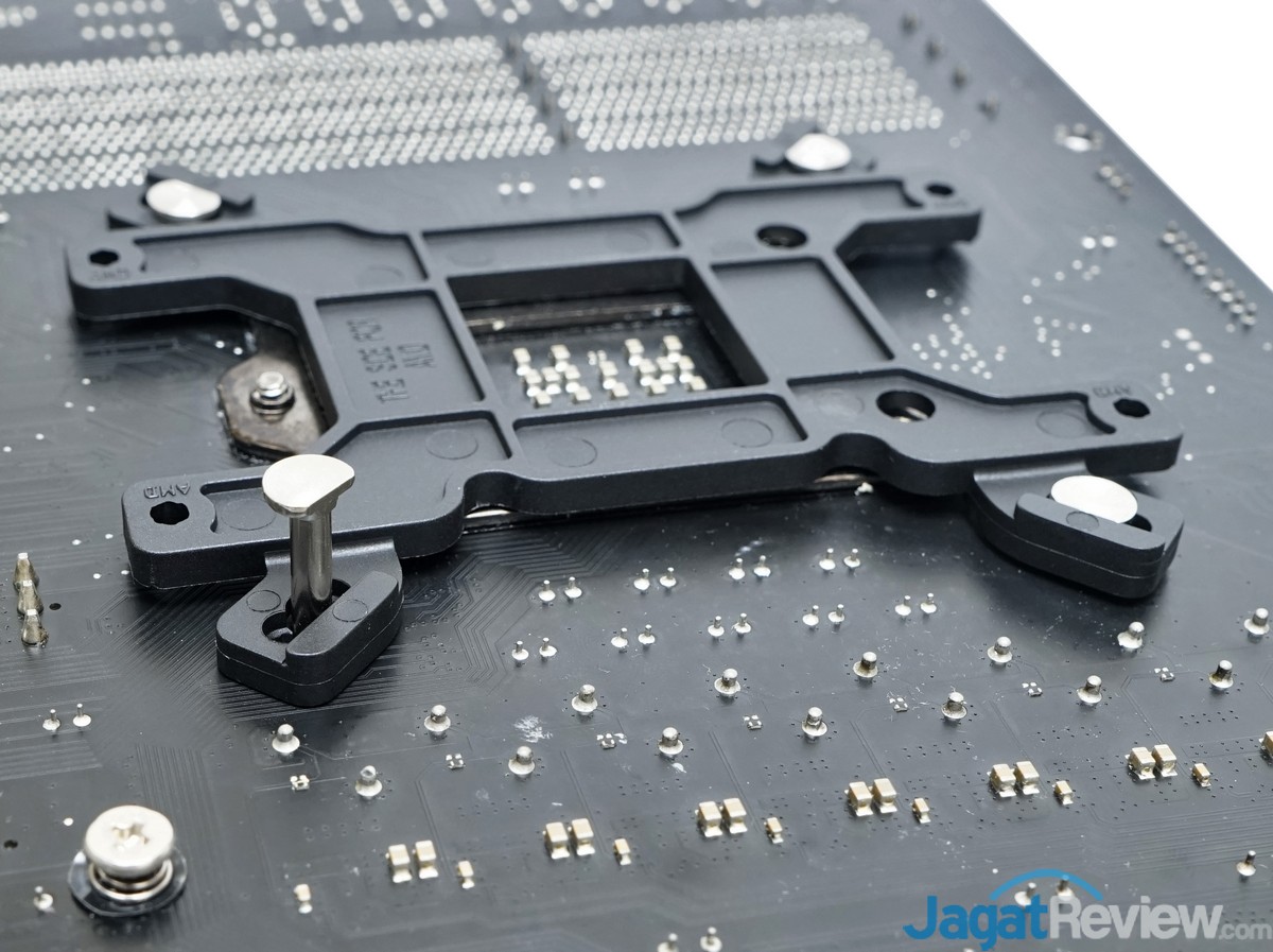 Untuk pemasangan Enermax ETS-T40fit Black Twister pada platform Intel LGA 1150 ini, pertama letakkan backplate pada bagian belakang motherboard.