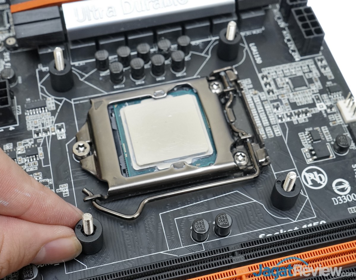 Selanjutnya, masukan baut mounting pada lubang baut yang telah disesuaikan posisinya dengan spesifikasi LGA 1150.