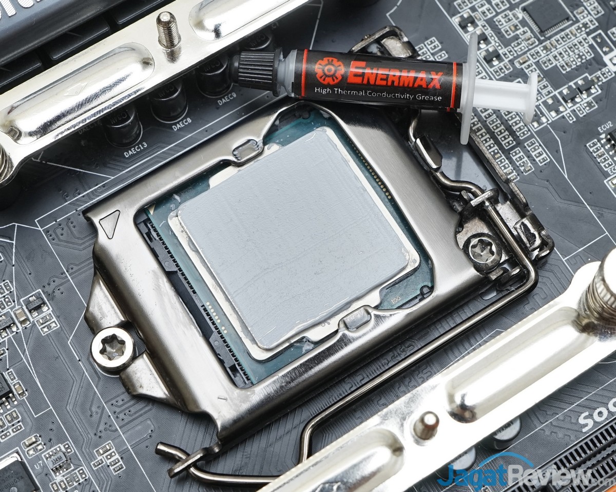 Sebelum memasang HSF ini ke prosesor, jangan lupa aplikasikan thermal paste ke dasar HSF atau ke prosesor. Di pengujian kali ini, kami mengoleskan dan meratakan thermalpaste bawaan pada bagian permukaan prosesor.