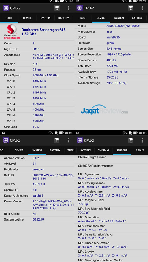 Adapun spesifikasi yang ditawarkan oleh ASUS Zenfone Selfie antara lain SoC Snapdragon 615 Octa-Core 64 bit (4x ARM Cortex 1,5 GHz + 4x ARM Cortex 1,1 GHz) dengan GPU Adreno 405 @550MHz dan RAM 3GB. Pilihan internal memori tersedia yaitu 16 GB dan 32 GB. Untuk produk yang kami terima menggunakan internal memori 32 GB. Namun sepertinya Zenfone Selfie memakan cukup banyak storage terutama pada RAM. Seperti yang terlihat pada CPU-Z, hampir 40% dari 3GB RAM yang tersedia telah dipakai oleh sistem. Namun sepertinya hal tersebut tidaklah mempengaruhi performa karena sisa kapasitas RAM masih cukup besar untuk menjalankan beragam aplikasi. Media penyimpanan bisa ditambahkan melalui microSD yang tersedia. Kapasitas baterai yang digunakan yaitu sebesar 3000mAh. Sensor yang tersedia pun lengkap,seperti Acceleration, Proximity, Ambience Light, Compass hingga Gyroscope.