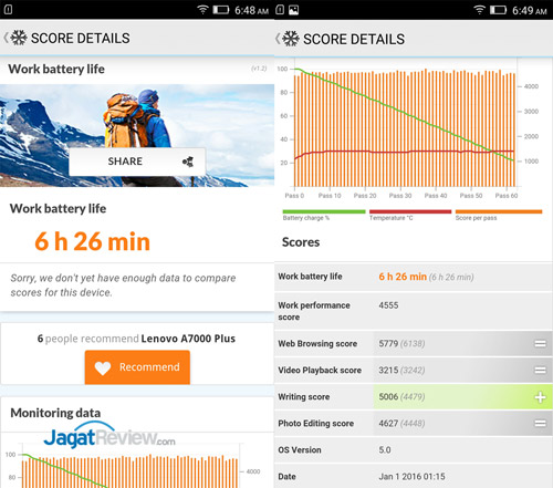 Pengujian baterai dilakukan menggunakan aplikasi benchmark PCMark. Dan hasil yang didapatkan untuk Lenovo A7000 Plus adalah 6 jam 26 min.