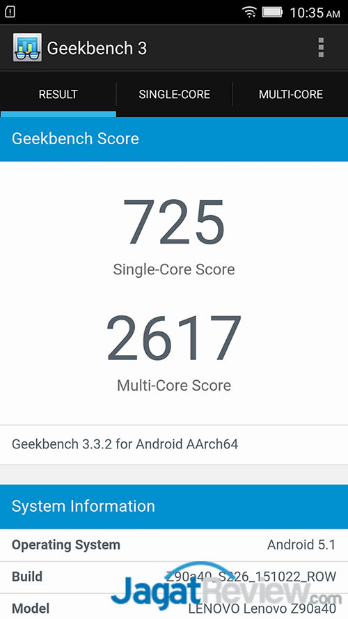GeekBench 3 merupakan benchmark cross platform yang mengukur kinerja prosesor sebuah perangkat smartphone, tablet, dan PC. Aplikasi ini menggunakan skenario simulasi real world sehingga mampu menganalisa performa sebuah prosesor saat menggunakan single core atau multi core. Semakin tinggi nilainya, semakin baik.