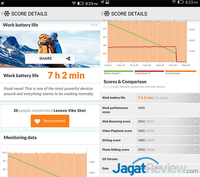 Kemampuan baterai pada perangkat kami uji dengan menjalankan tes baterai yang terdapat di aplikasi PCMark. Aplikasi ini memberikan simulasi kerja secara terus menerus dan berulang-ulang, seperti browsing, edit foto, video playback, writing dan lain-lain. Hasilnya baterai dari Lenovo VIBE Shot mampu bertahan 7 jam 2 menit. Sayangnya, tidak ada dukungan Fast Charging pada smartphone ini sehingga mengisi ulang dayanya bisa jadi lebih lambat ketimbang smartphone sejenis.