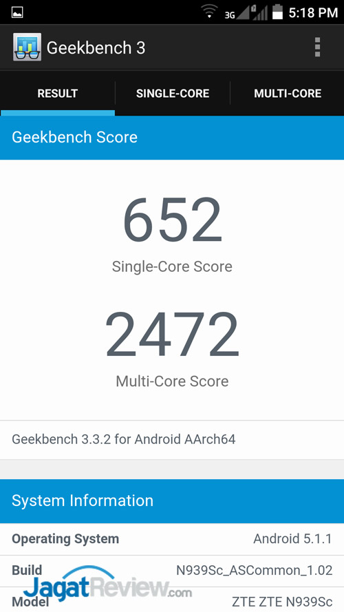 GeekBench 3 merupakan benchmark cross platform yang mengukur kinerja prosesor sebuah perangkat smartphone, tablet, dan PC. Aplikasi ini menggunakan skenario simulasi real world sehingga mampu menganalisa performa sebuah prosesor saat menggunakan single core atau multi core. Semakin tinggi nilainya, semakin baik.
