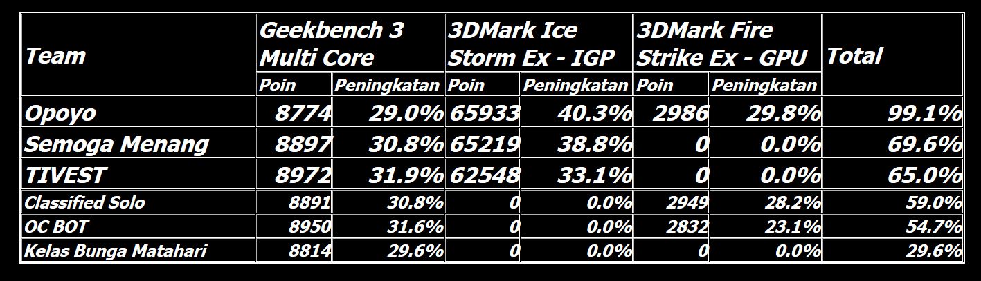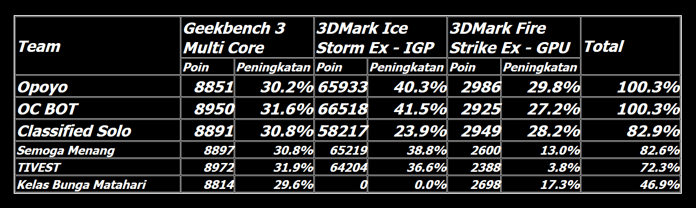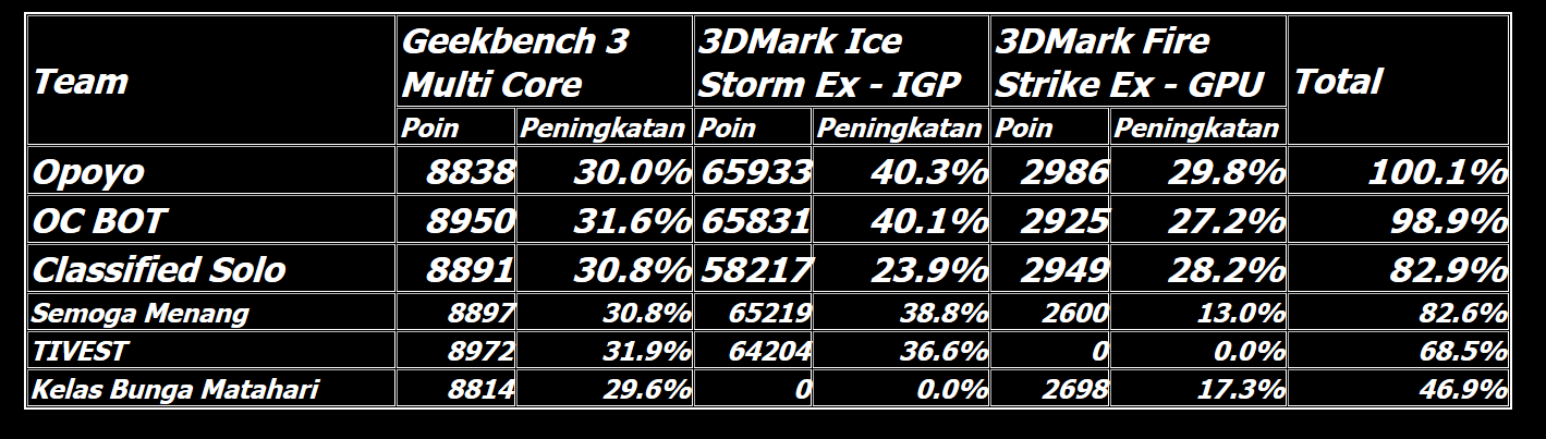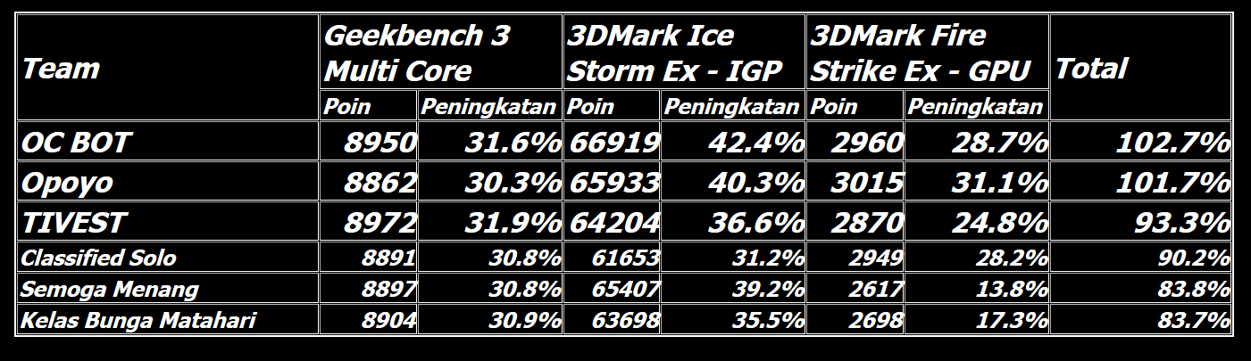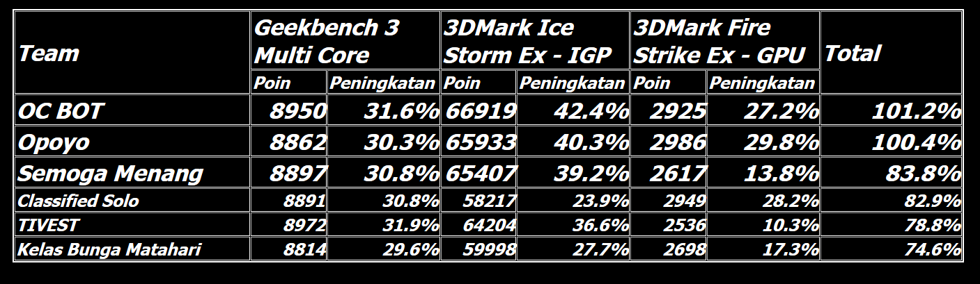Memasuki 30 menit terakhir, Opoyo masih berhasil mempertahankan posisi mereka di puncak klasemen sementara. OC BOT berhasil menyodok ke posisi kedua setelah mencatatkan skor 3DMark Ice Storm Extreme di IGP. Classified Solo, tim satu kampus dari Opoyo, menguntit di posisi ketiga. Keempat tim di posisi teratas telah mencatatkan skor di semua benchmark.