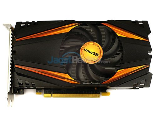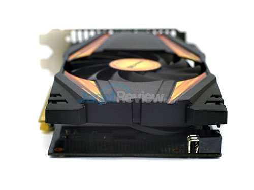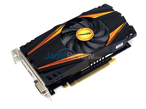 Dari segi desain, graphic card ini memang terlihat tidak spesial. Bodinya diselimuti cover plastik hitam dengan stiker berwarna jingga. Di atas sistem pendingin dual-slotnya, Anda hanya akan menemukan sebuah kipas pendingin 9 cm yang dilengkapi fitur 0db. Hadir dengan kipas tunggal membuat ukuran graphic card ini juga tergolong pendek, di angka 20,5 cm. Itu artinya graphic card ini dapat dengan mudah masuk ke dalam casing yang memiliki ruang yang sempit.