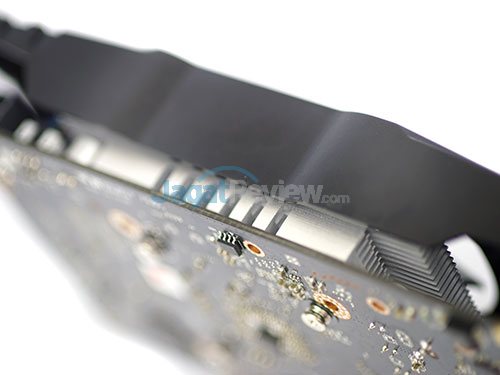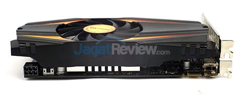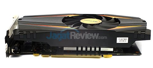 Dari bagian belakang, Anda akan menemukan fakta bahwa, PCB graphic card ini sedikit lebih pendek dari frame pendinginnya. Itu artinya, sebenarnya graphic card ini bisa tampil lebih kompak lagi dari desain saat ini. Sepertinya graphic card ini memang ditujukan untuk gamer dengan budget terbatas, Anda juga tak akan menemukan backplate yang sebenarnya tak diperlukan untuk graphic card ini.