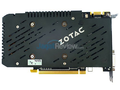 Di bagian belakang Anda akan menemukan backplate yang betugas menjaga ke kokohan dari PCB graphic card ini. Menariknya backplate ini tak hanya menyelimuti bagian belakang dari graphic card ini, namun juga hingga ke sisi-sisi graphic card sehingga membuat graphic card ini terlihat seperti diselimuti sebuah sistem pendingin ini