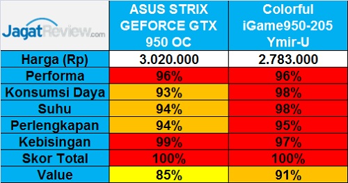 Predikat Best Value tak kami berikan pada produk yang tak hanya murah tetapi juga bisa menawarkan harga terbaik untuk semua yang ditawarkan dalam paket penjualannya dan tentunya performanya. Nilai keseluruhan dari setiap produk kami bandingkan dengan harga yang ditawarkan di pasaran. Dan, penghargaan Best Value ternyata mampu disabet oleh dua peserta test perbandingan ini, yaitu Digital Alliance GTX 950 StormX dan Zotac GTX 950 OC. Kedua GeForce GTX 950 tersebut berhasil menawarkan produk dengan harga sangat kompetitif dengan overall package yang menarik dan performa yang cukup mumpuni.