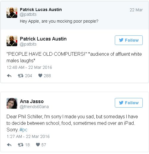 Berbagai komentar di Twitter pun bermunculan menanggapi masalah tersebut. Produk Apple sendiri bisa dibilang berharga tidak murah. Untuk MacBook sendiri dihargai mulai dari US$ 1200, sementara iPad Pro sendiri paling murah dibanedrol sekitar US$500. Tentunya nominal tersebut masih terbilang sangat fantastis dan tidak semua kalangan dapat membelinya, bahkan di negara makmur seperti Amerika Serikat.