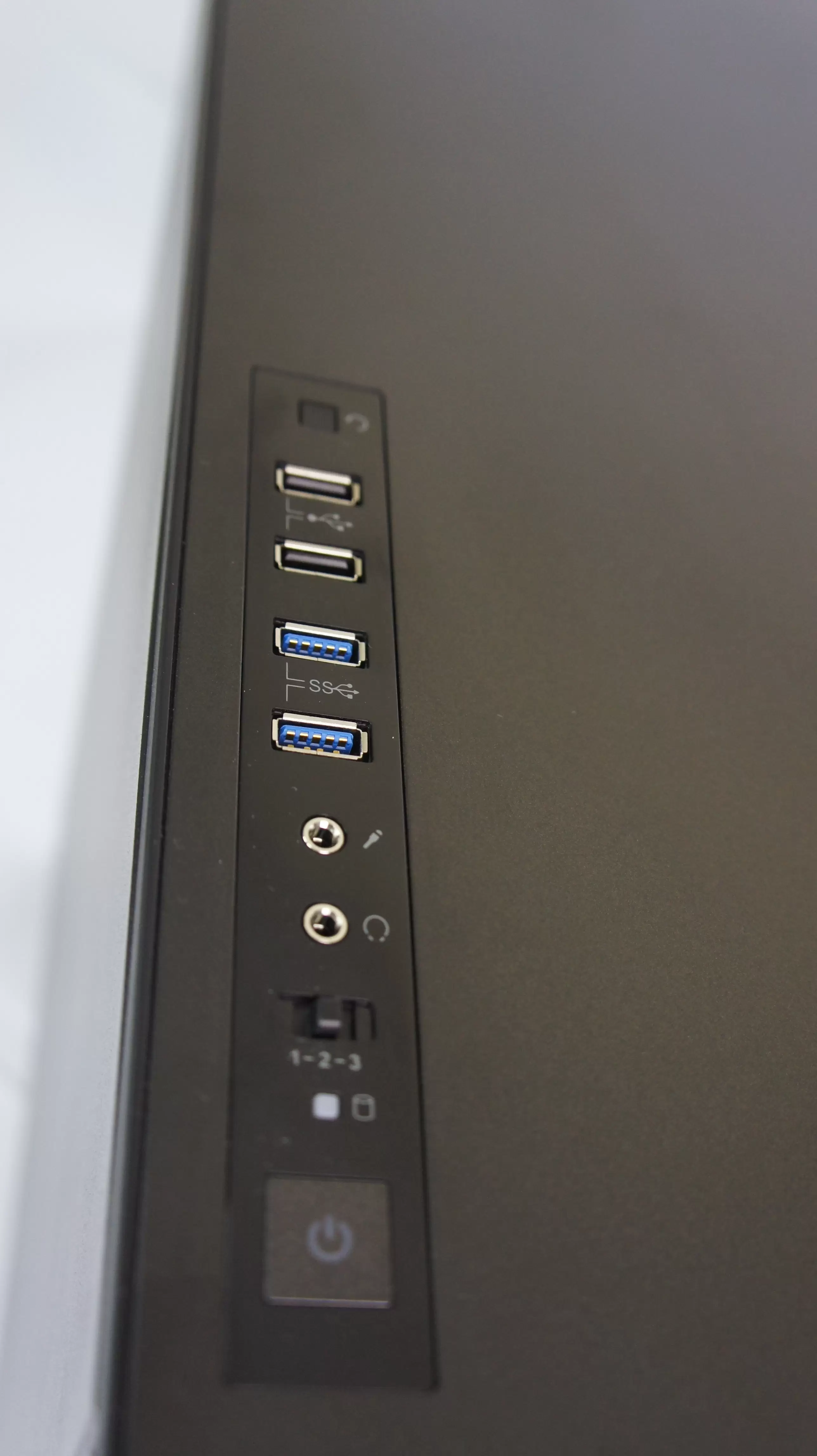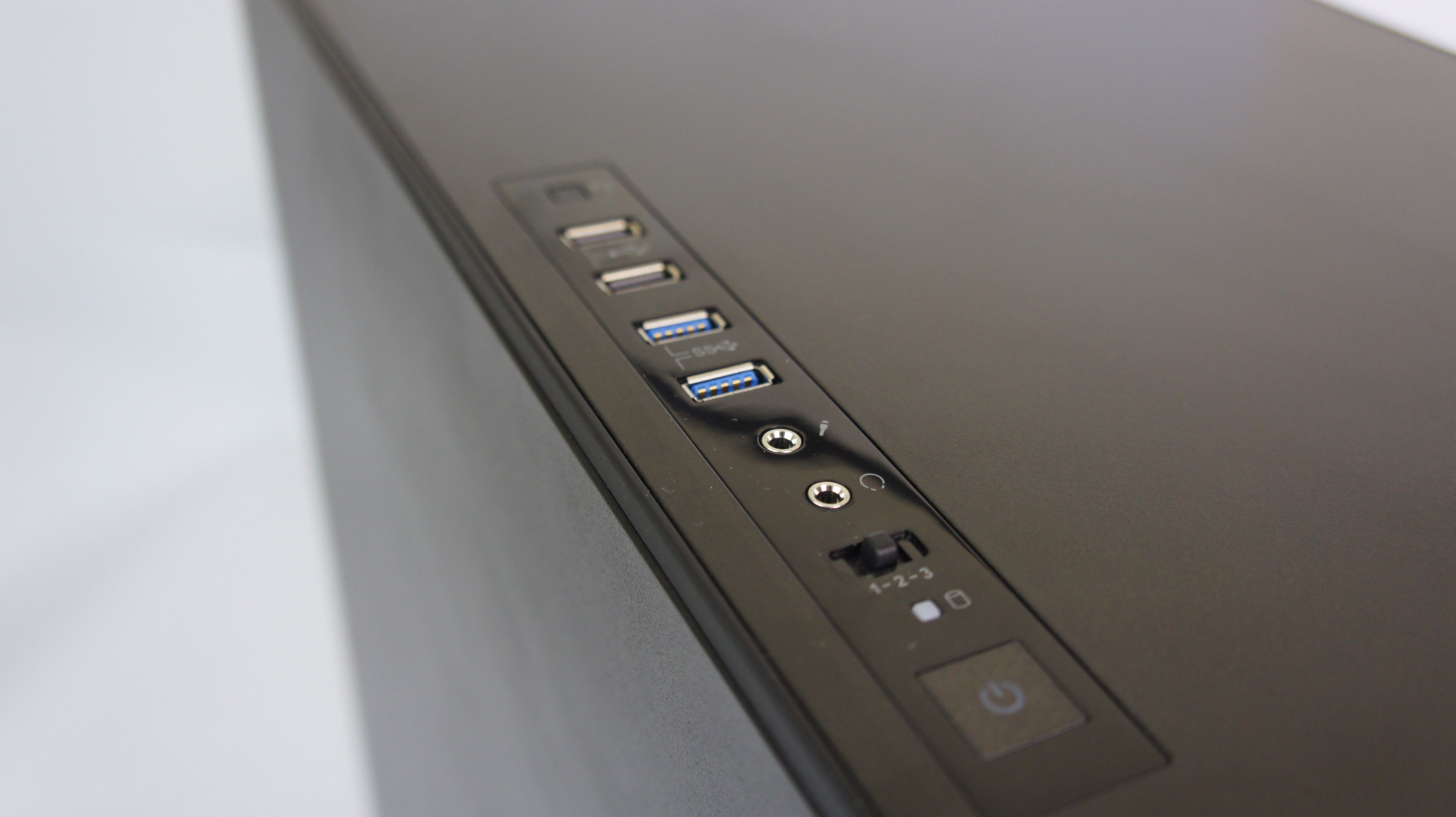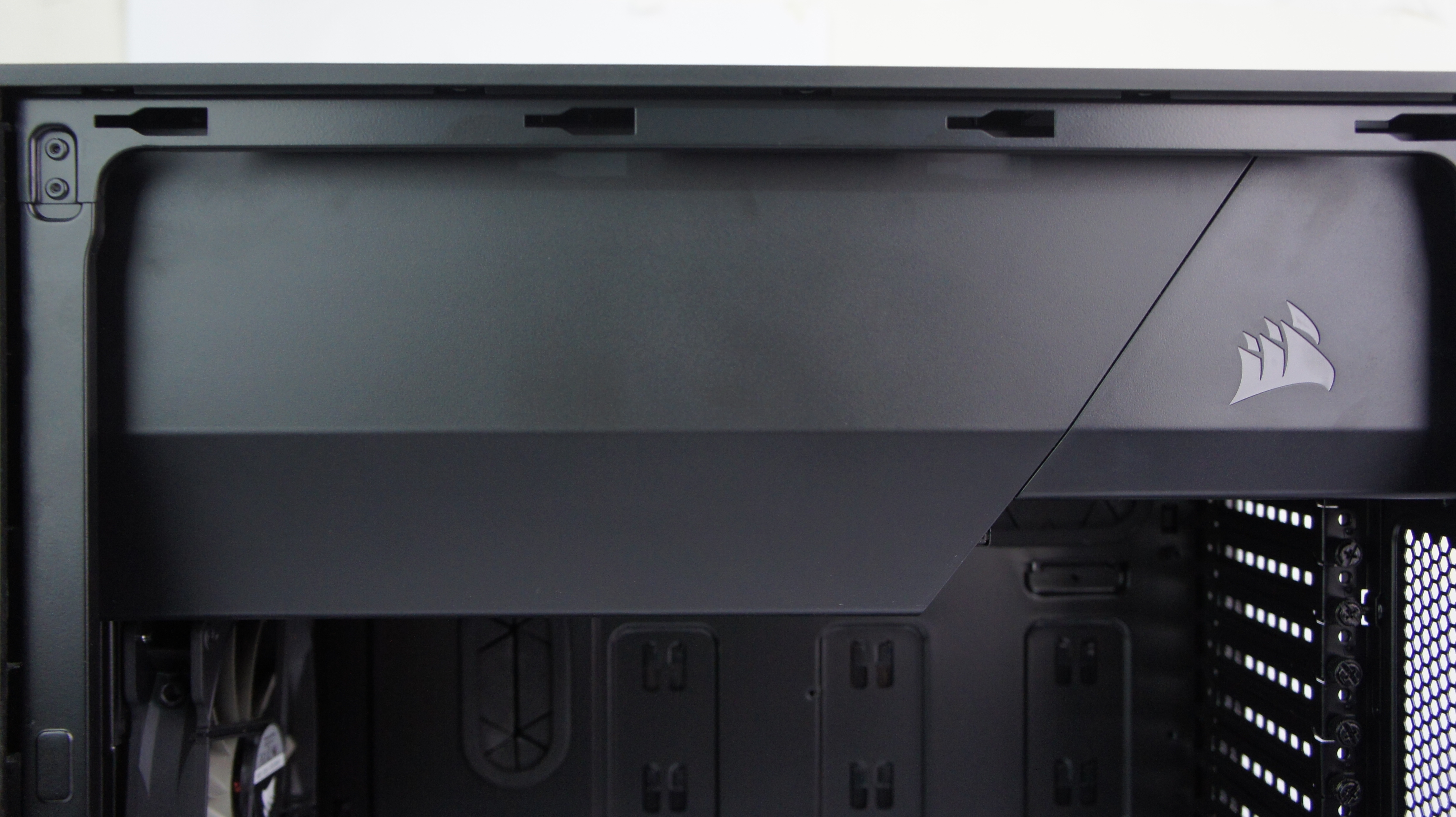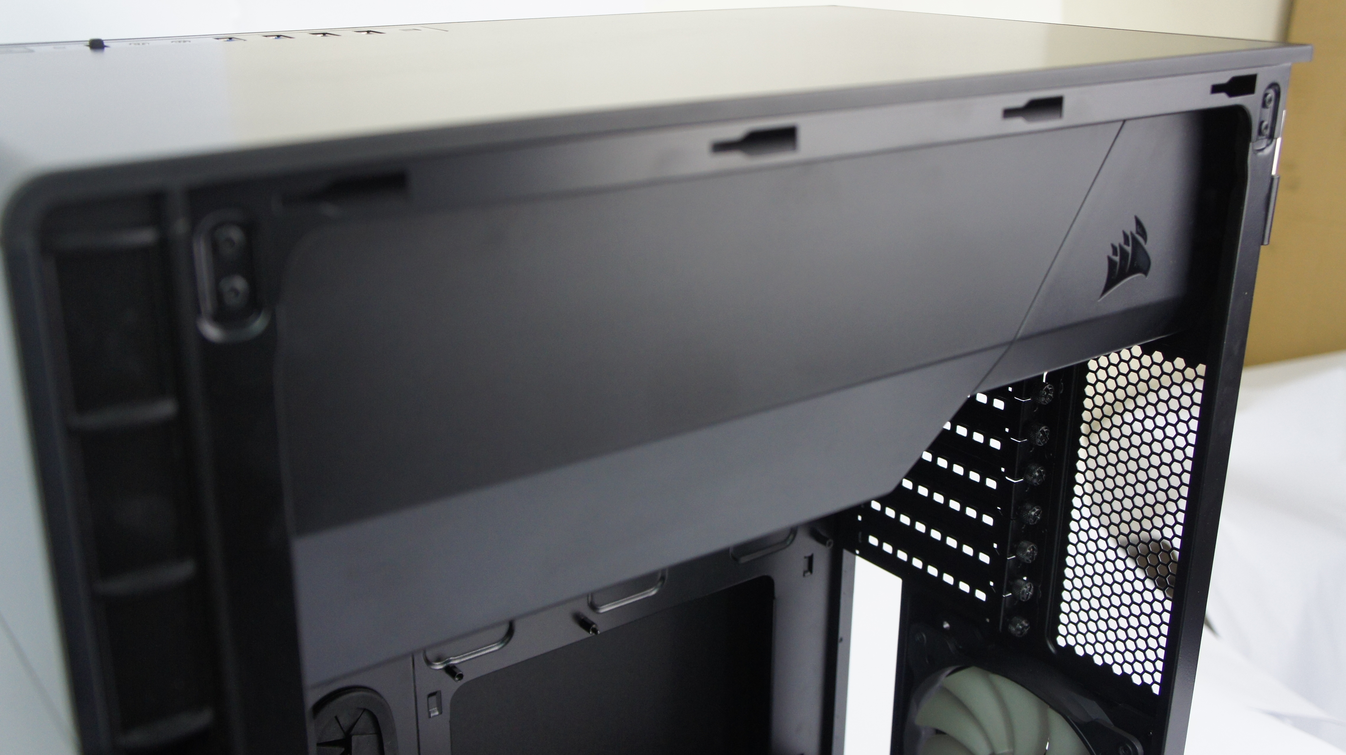 Beralih ke bagian front panel. Corsair meletakkan front panel berisi tombol dan port di bagian atas casing ini. Hal ini membuat tampilan bagian depan casing terlihat flat, sehingga menimbulkan kesan elegan. Terdapat tombol power dan reset di bagian ini, di mana keduanya akan menyala dengan backlight dari lampu LED. Corsair menyediakan switch fan control di bagian ini, sehingga pengguna bisa dapat dengan mudah mengatur kecepatan kipas di dalam casing tanpa harus repot membuka casing terlebih dahulu. Carbide 600C menggunakan switch dengan 3 mode kecepatan fan. Sementara untuk konektivitas, terdapat dua USB 2.0 dan dua USB 3.0, beserta port untuk audio.