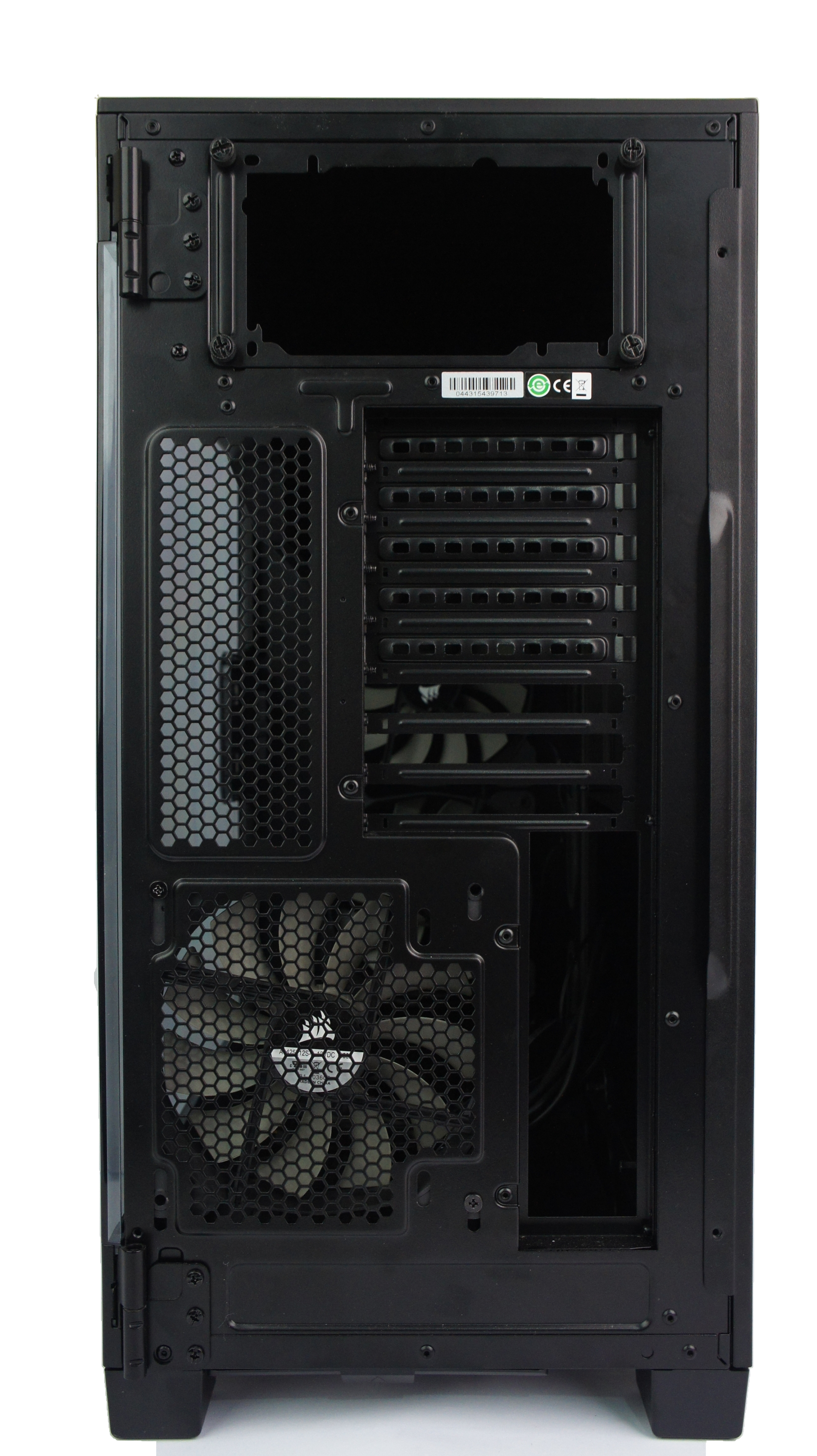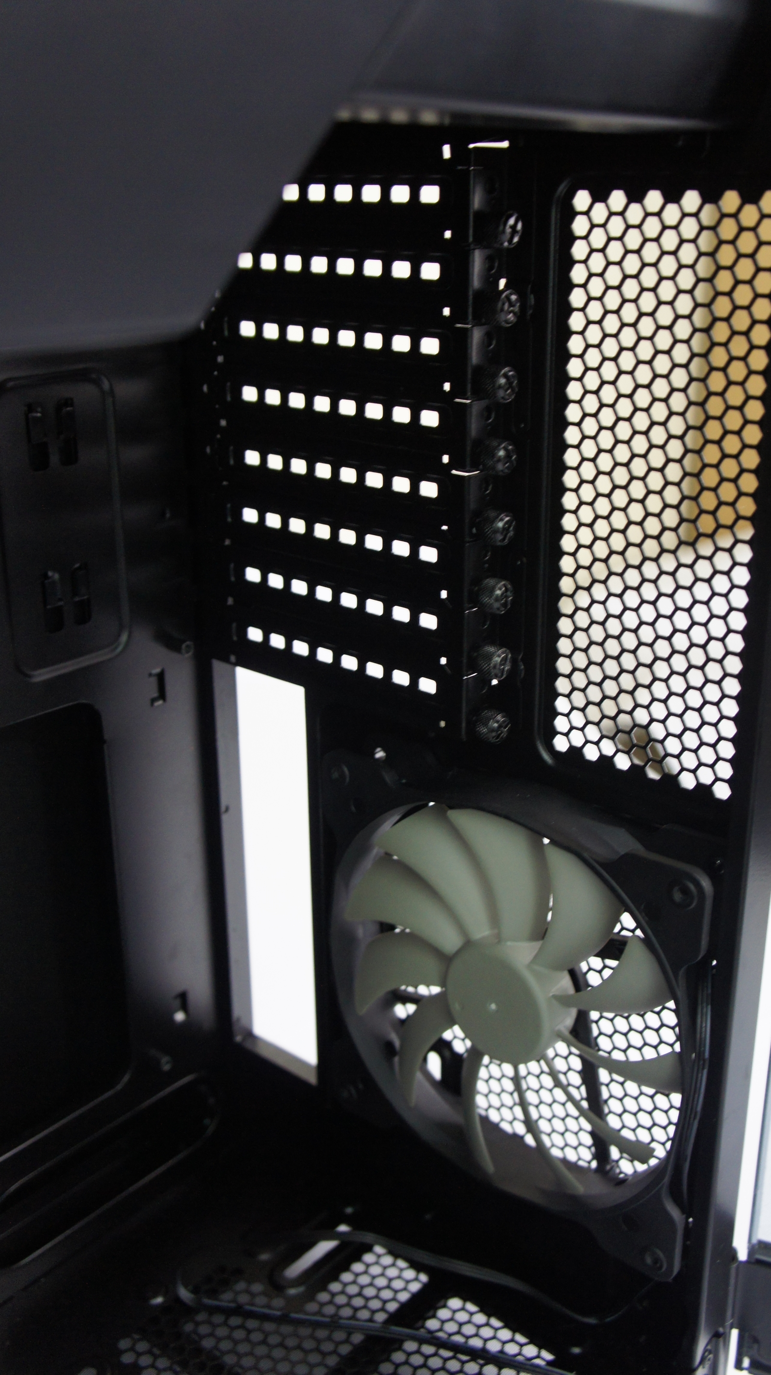 Di bagian belakang, kita dapat melihat lubang untuk port I/O dari motherboard, lubang untuk PSU, serta area slot ekspansi. Casing ini mampu mengakomodasi 8 slot ekspansi untuk berbagai I/O, mulai dari VGA, sound card, dan lain sebagainya.