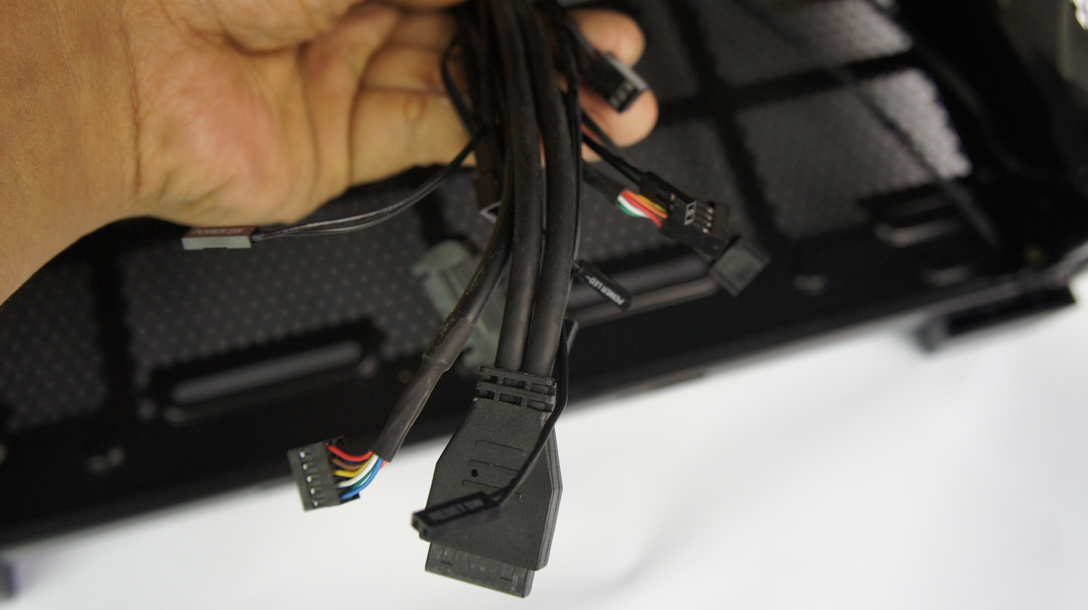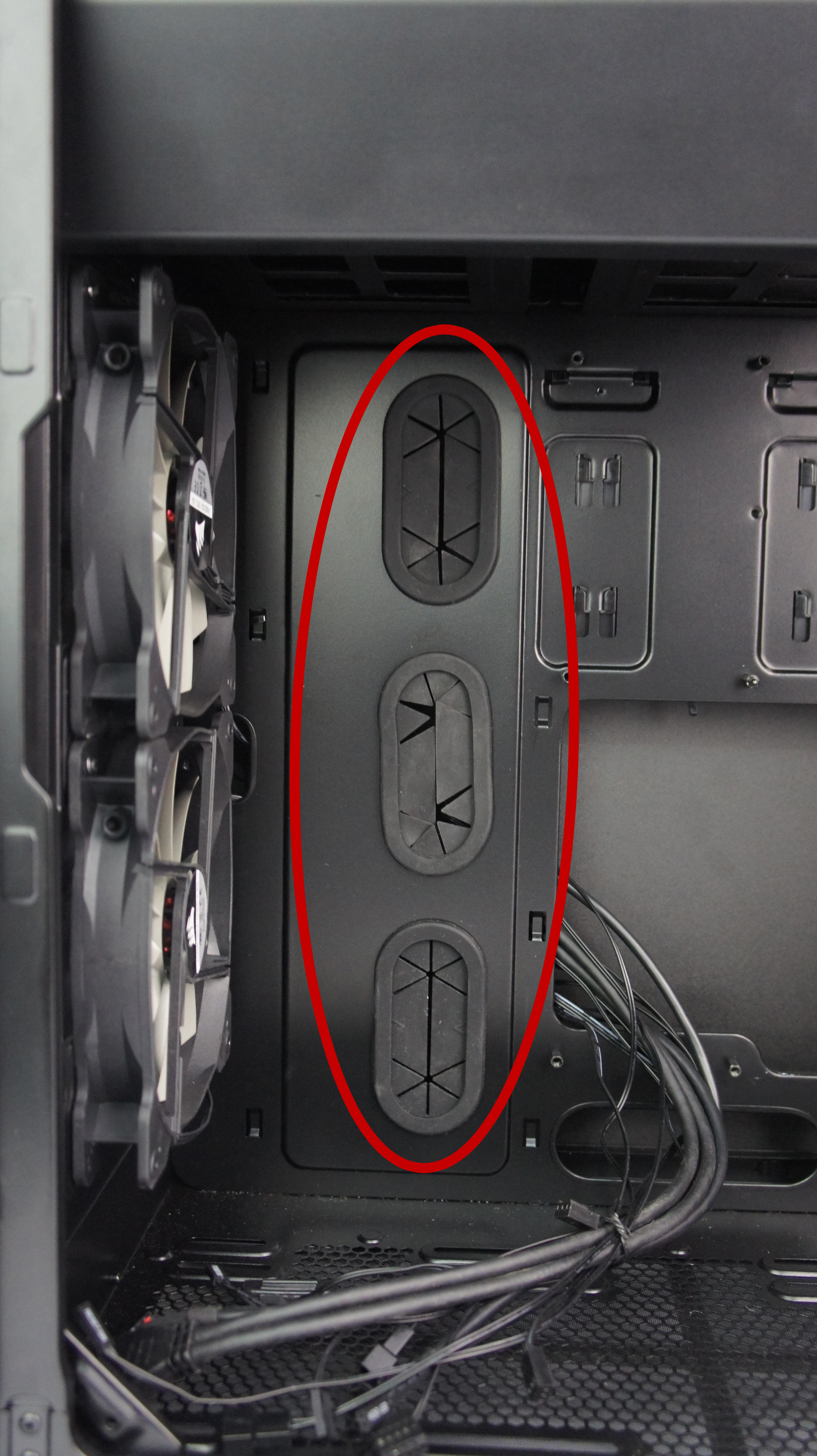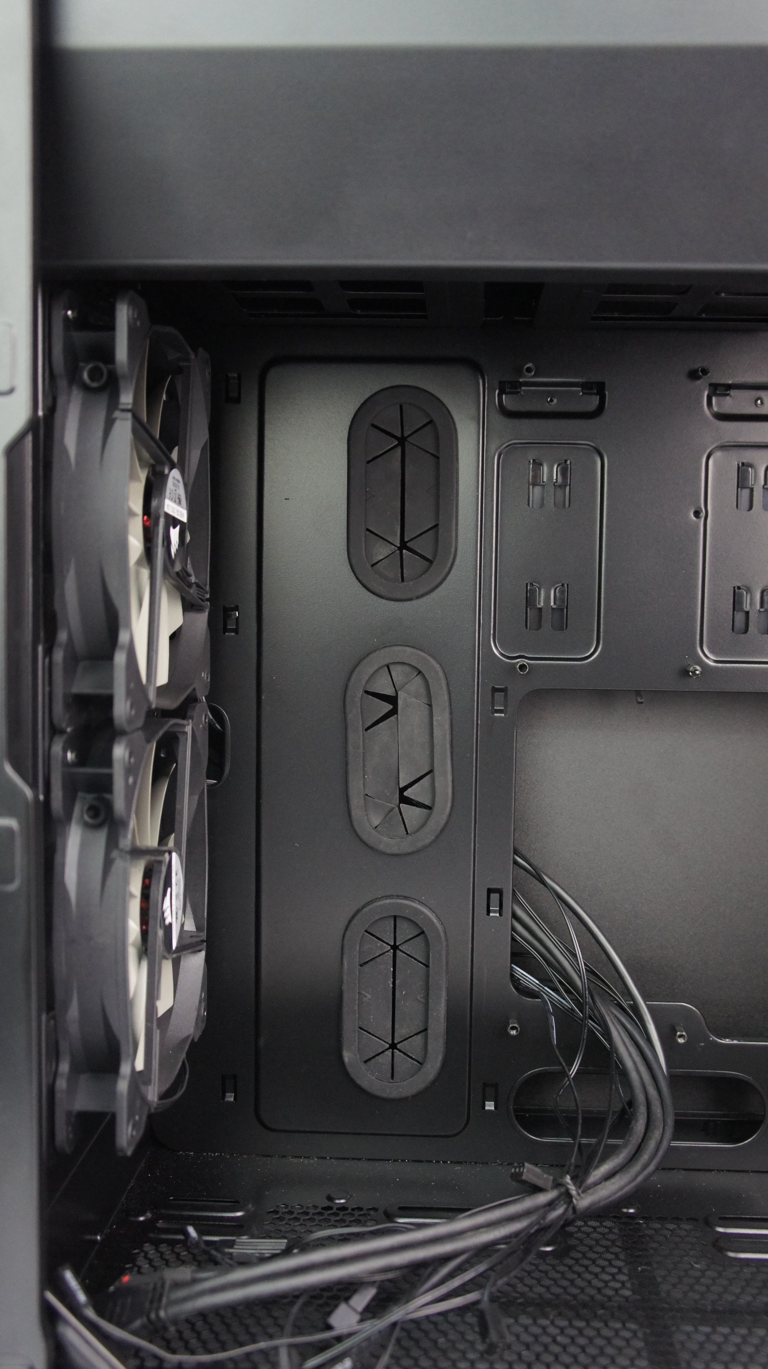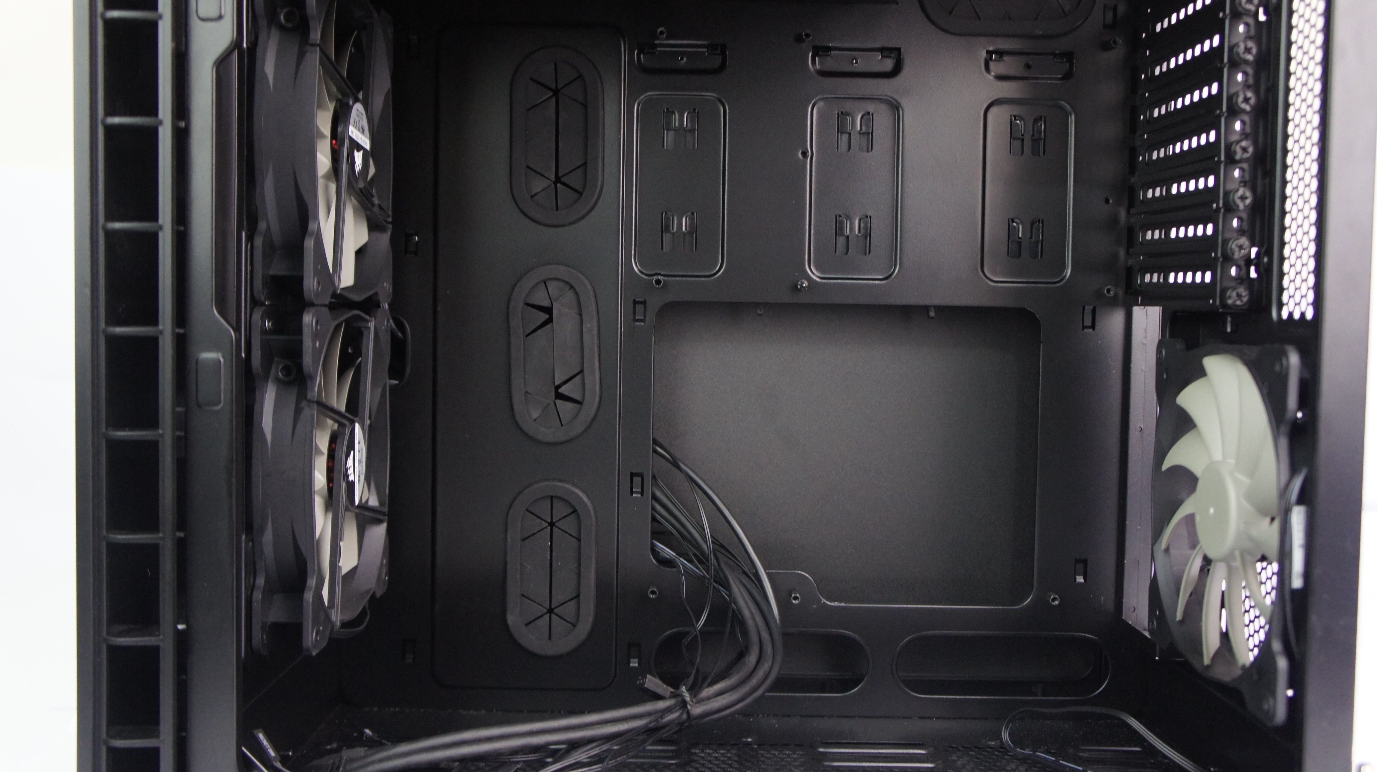Aspek cable management juga diperhatikan Corsair di casing ini. Mereka menyediakan lubang-lubang yang membantu cable management yang baik, yang sebagian dilengkapi dengan rubber grommet untuk menyembunyikan kabel. Selain di bagian tray motherboard, terdapat beberapa lubang lain di bagian bawah yang sayangnya tidak dilengkapi dengan rubber grommet.