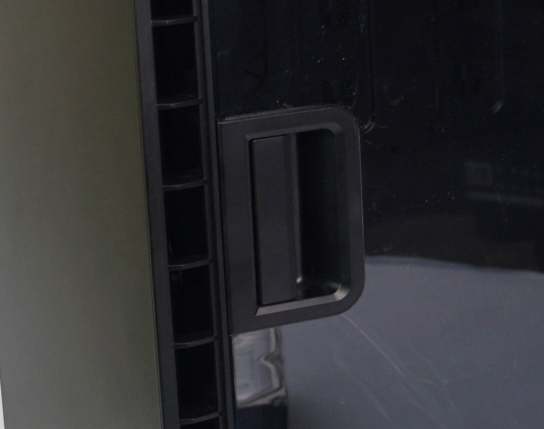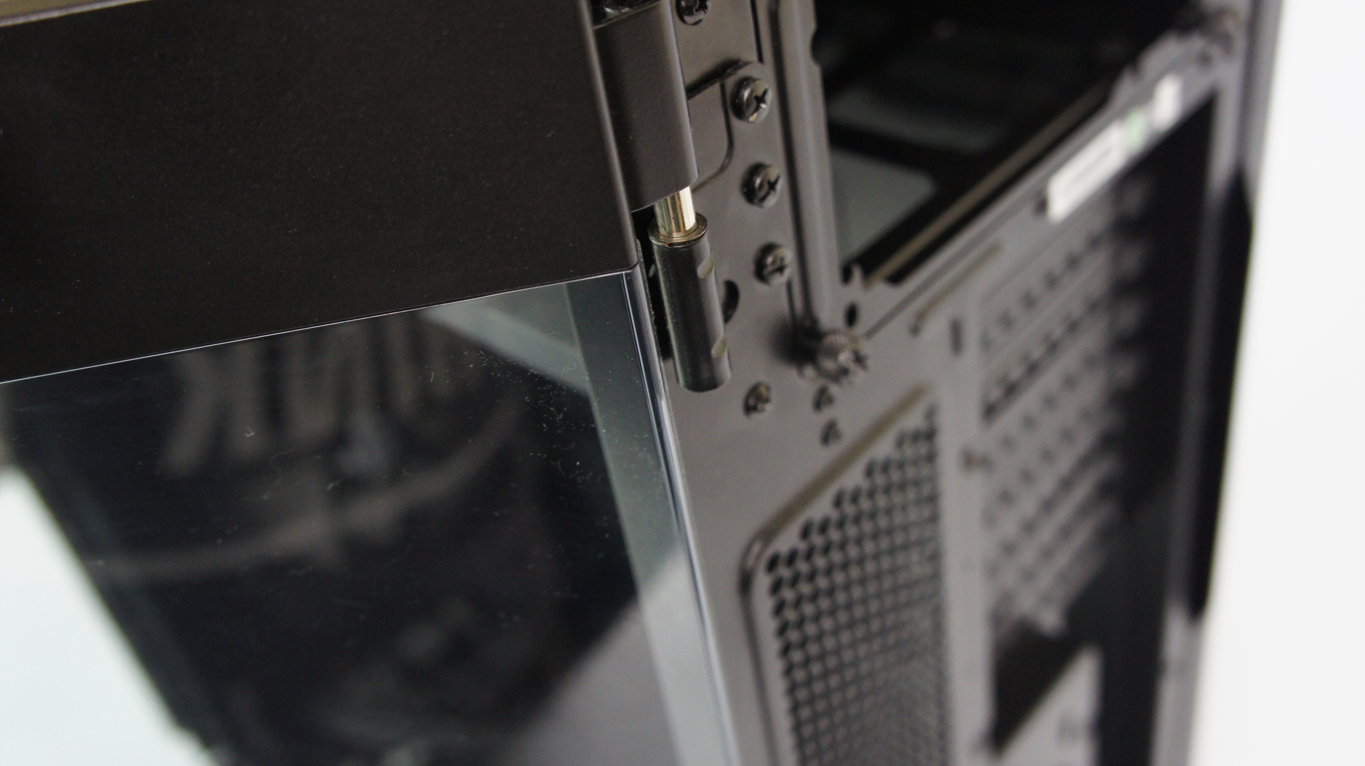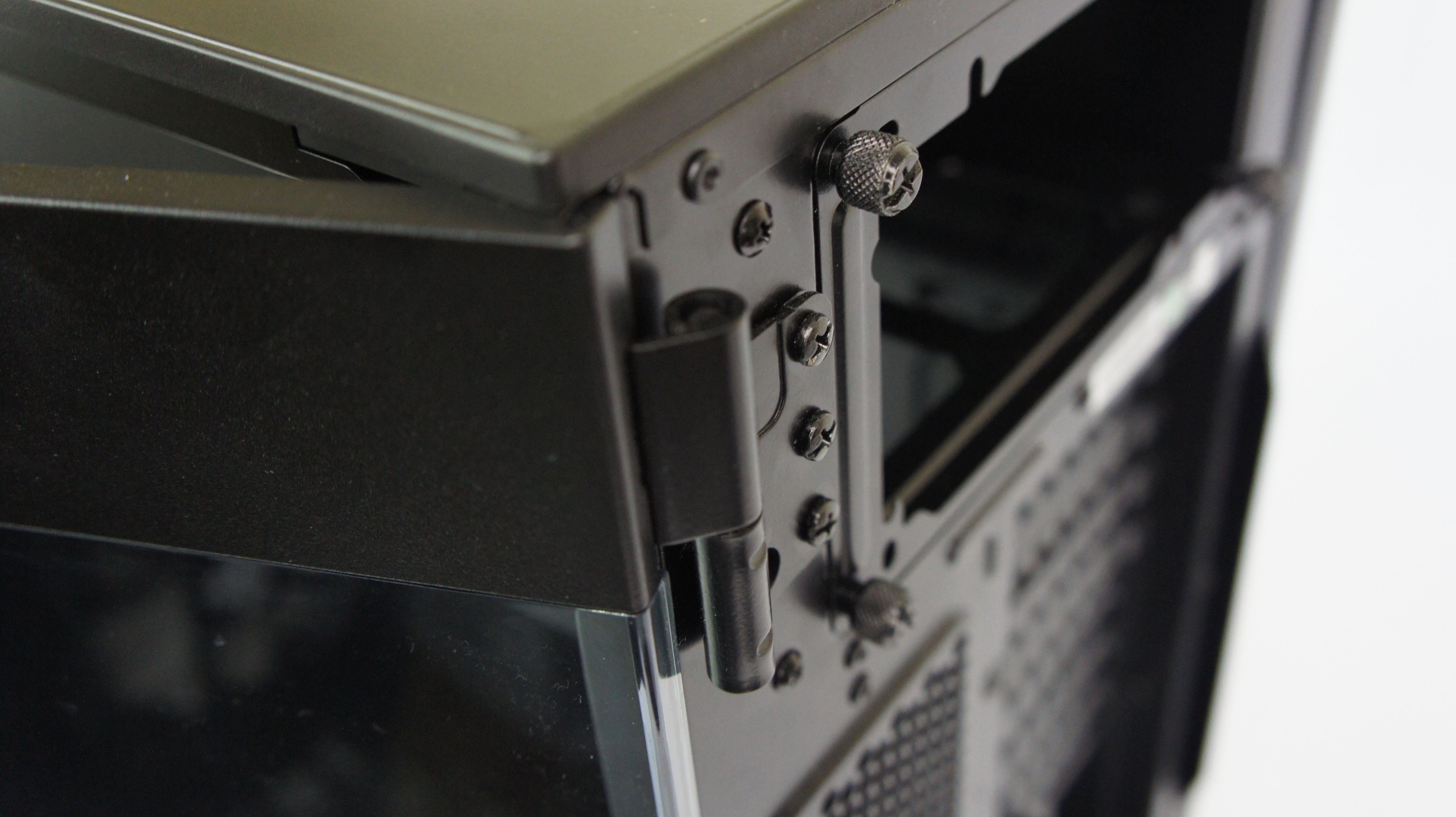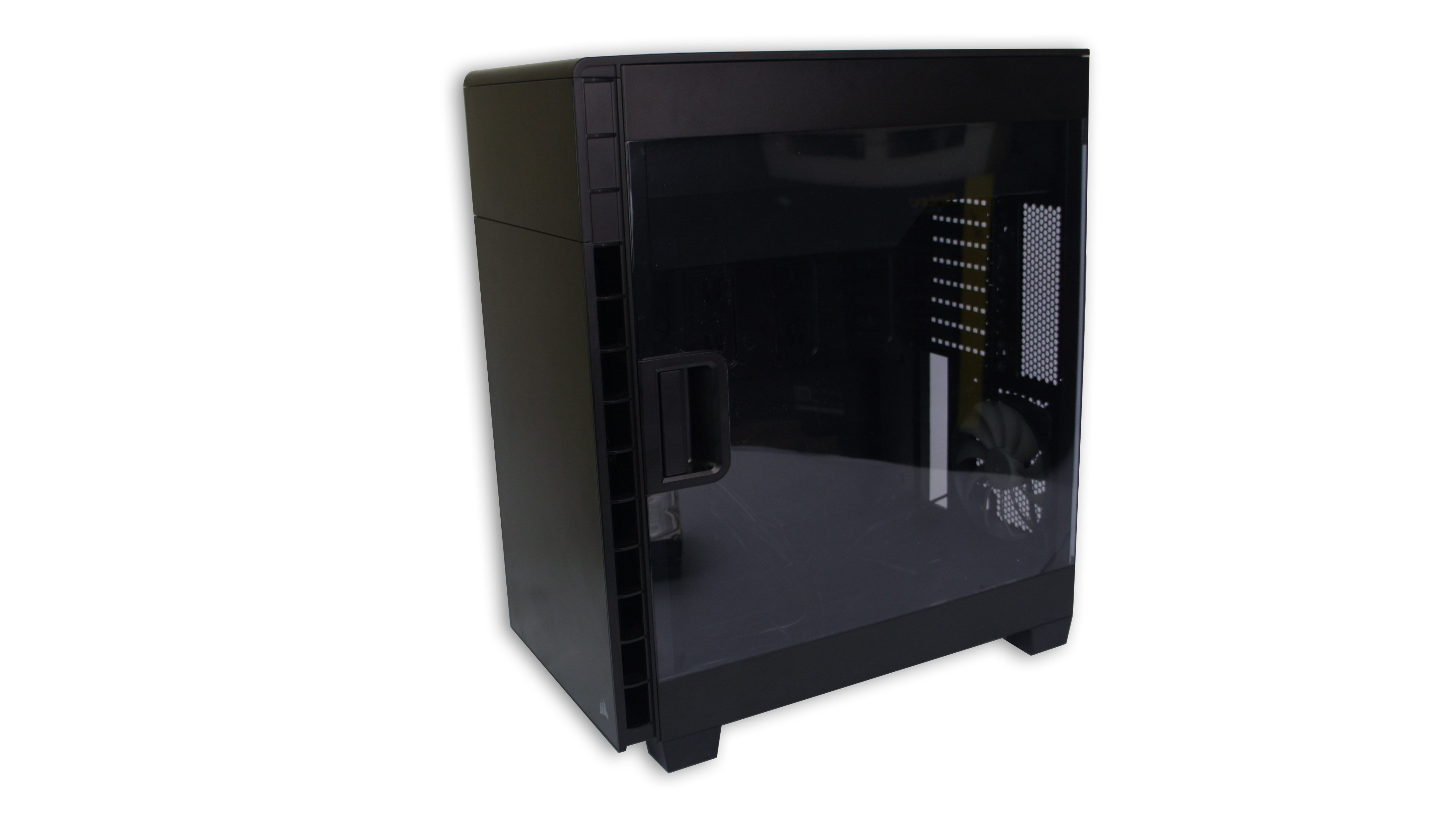 Beralih ke bagian side panel. Untuk Carbide 600C ini, Corsair menyediakan side panel kanan dalam bentuk jendela akrilik frameless. Pengguna dengan mudah dapat melihat ini dari casing ini. Di dekat bagian depan dari side panel, terdapat handle dengan bentuk elegan untuk membuka side panel ini. Ketika dibuka, engsel akan menahan side panel sehingga tidak langsung terlepas dari casing. Namun, bila Anda butuh melepas total side panel tersebut, misalnya ketika perakitan sistem, Anda bisa menariknya ke atas untuk melepasnya dari engsel.