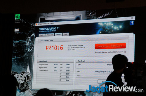 Bisa dilihat bahwa solusi GTX 1080 notebook memberikan performa setara dengan GTX 1080 kelas desktop. Kami juga mendapat informasi bahwa notebook yang sedang di-demokan ini sedang berjalan di mode ‘Turbo’ sehingga kemungkinan clockspeed-nya sudah sedikit meningkat dari default-nya.
