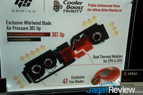 Suhu tinggi ini nantinya berpotensi memperpendek umur komponen, atau juga membuat berbagai komponen seperti CPU dan GPU di dalam laptop tersebut beroperasi di bawah kecepatan maksimalnya. Ini yang membuat MSI sangat memperhatikan solusi cooling untuk notebook gaming mereka. Tidak main-main, MSI memiliki sebuah cooler bernama Cooler Boost Titan, dilengkapi lebih dari 10 heatpipe untuk mendinginkan berbagai komponen seperti CPU dan GPU di dalam notebook kelas atas mereka(GT Series) . Ada juga Cooler Boost Trinity yang dirancang untuk notebook tipis mereka (GS series)